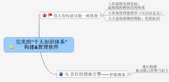⒉我们一般说的“树状图“在PinPKM里叫”个人知识体系“,除了能自定义图标、能上下移分类外,这跟微软的资源管理器差不多,剩下的都是些不实用的功能。而相反的,在这款号称最好的个人知识管理软件却拥有强大的搜索功能。这就造成了这样一个趋势:PinPKM离以知识点为中心的搜索引擎更近,但对于”构建个人知识体系“的终极目的却疏远了。我们知道,构建个人知识体系的好坏在于“树状图“,搜索只是一个辅助功能——为了快速找到自己想要的文件。